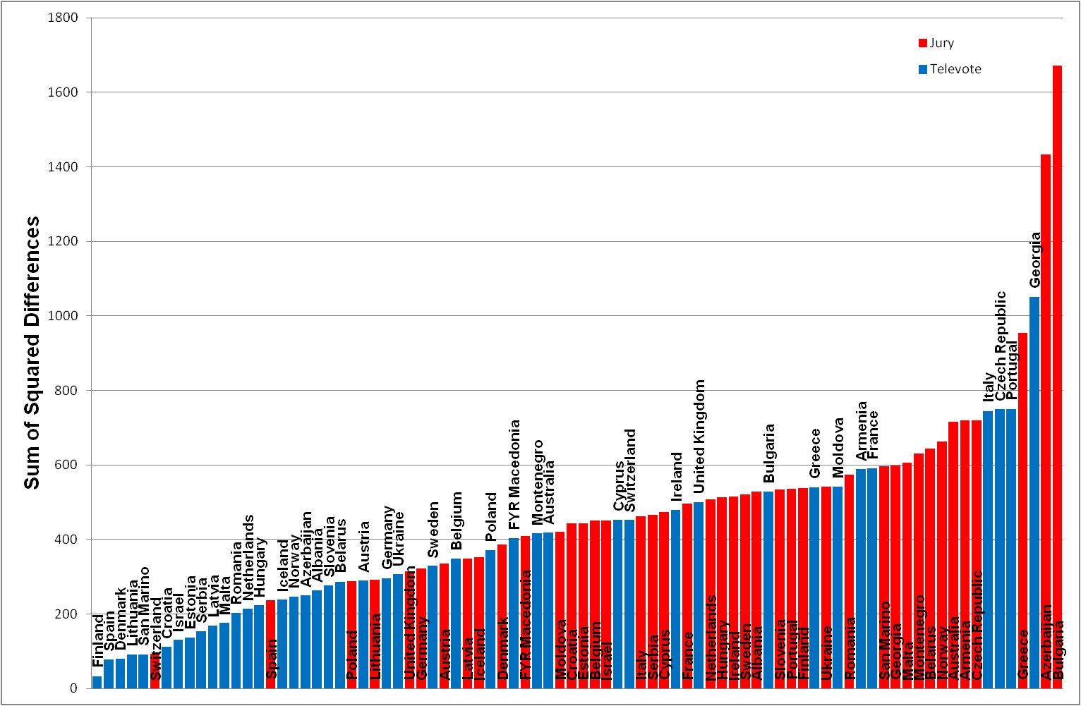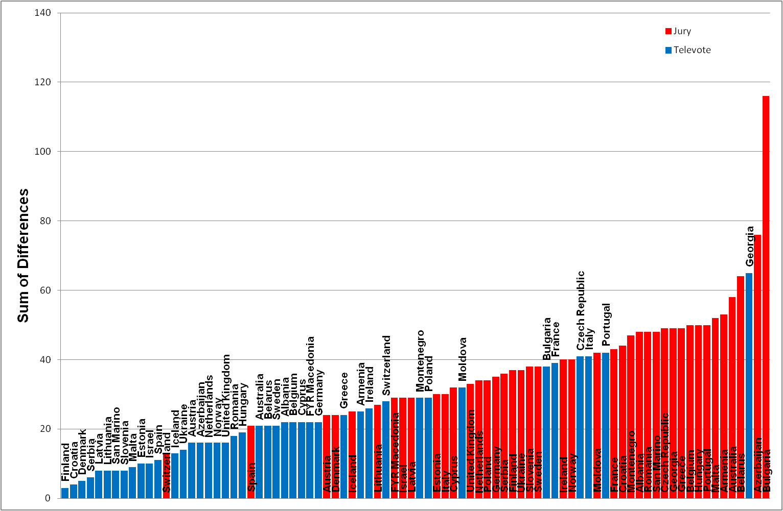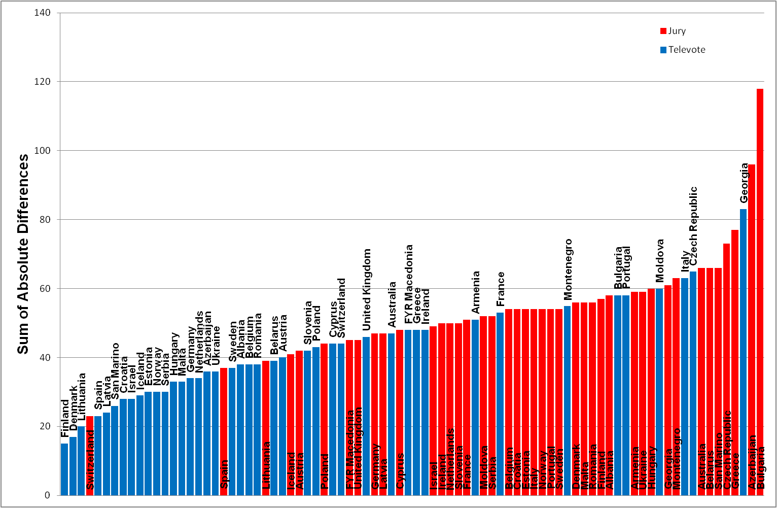 An inspection of the order of specific countries in Figures 2 and 3 can be revealing. The Croatia televote is shown as second in Figure 2 but eighth in Figure 3, indicating the 'simple difference' approach has under-estimated the scale of the deviation. The order of the UK votes also changes dramatically. Based on 'simple differences' the UK televote is ranked 20th and the jury vote 49th whereas the televote becomes 37th and the jury vote 36th when using 'absolute differences'.