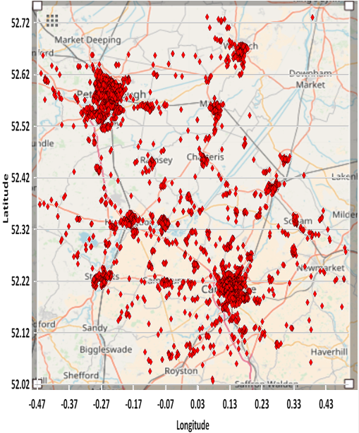The following figure is a representation of the Cambridgeshire data overlaid on a map (courtesy of OpenstreetMap). Note that the distribution of datapoints appears to be different in Figures 3, 4 and 5. The reason is that the horizontal and vertical dimensions of the scatter plot graph are stretched and not in proportion to the actual geographic (logitude and latitude) ranges (as they are in Figure 4).
