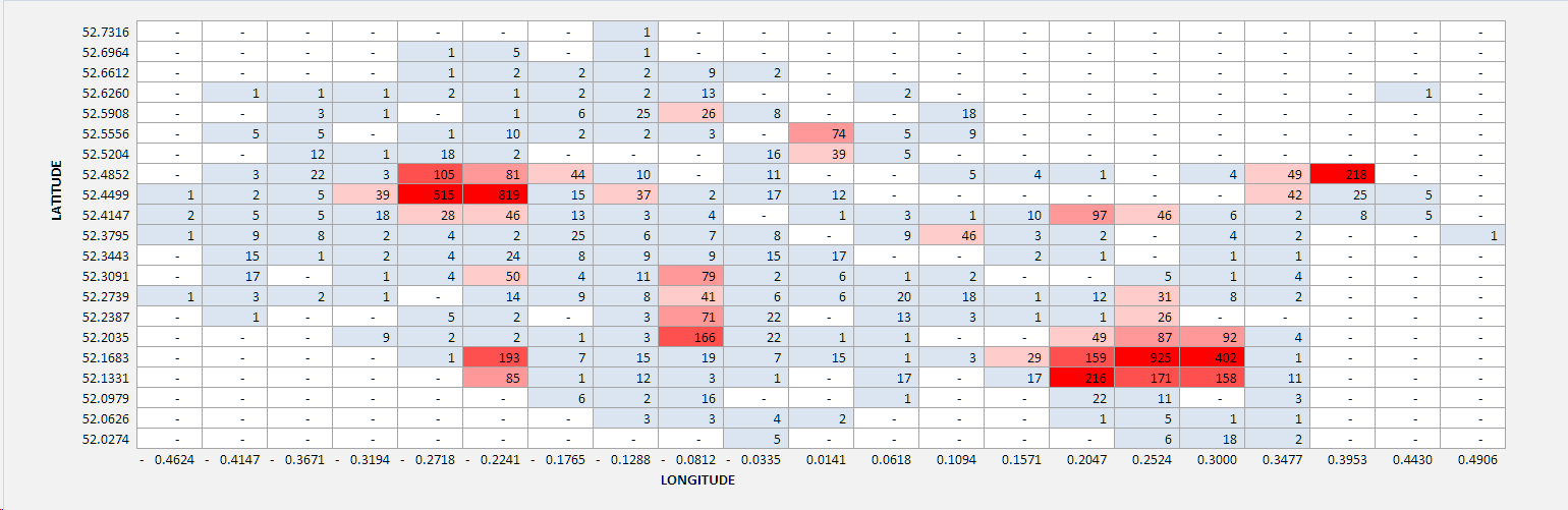 Another useful analytical tool to aid our understanding of dataset distribution is the heatmap. This shows the relative intensity and spread of the features being measured across the domain - in our study, the number of crimes committed across Cambridgeshire in January 2018. I have arbitrarily segmented the data into 20 divisions (horizontally and vertically). This clearly highlights the regions where most (red) and least (white) crimes are committed.