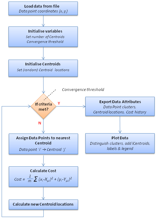 Further complexity can be incorporated into the algorithm to include iterative loops that explore the impact of different numbers of centroids and, for a set number of centroids, how their initial positions influence the rate of convergence, their final coordinates and the Cost.