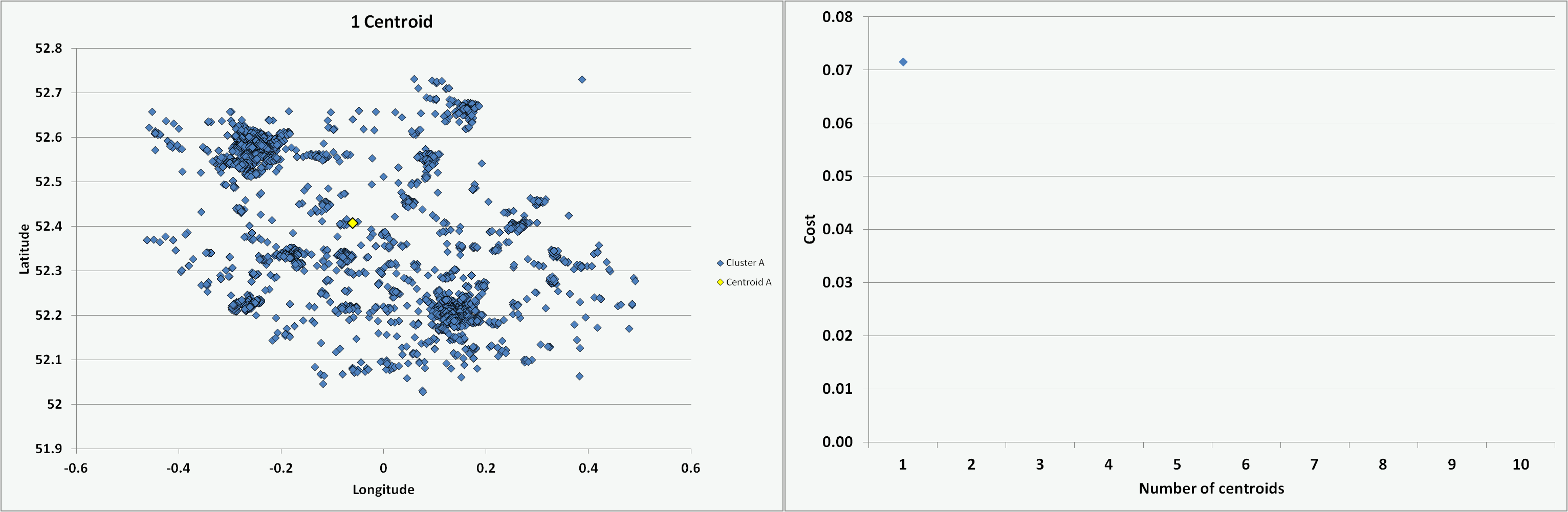 One of the challenges is to determine the optimal number of centroids or clusters to use. For the chosen Cambridgeshire crime dataset, I ran the programme coded in VBA multiple times with an increasing number of centroids (from 1 to 10) and on each occasion starting with randomised centroid locations. The animation below presents the results of the clustering - illustrating the different data groups and final centroid positions, and the cost associated with the number of centroids. The shape of the cost curve is typical, with each centroid addition reducing the total cost (i.e. montonically decreasing) but the scale of each change becoming smaller. Where the curve has a notable point of inflection or 'elbow' this can mark the point of optimal cost improvement and indicates the best number of centroids to use. Based on this guideline, figure 5 would suggest a suitable value to use for the number of centroids (K) on this dataset might be 3 or 4.