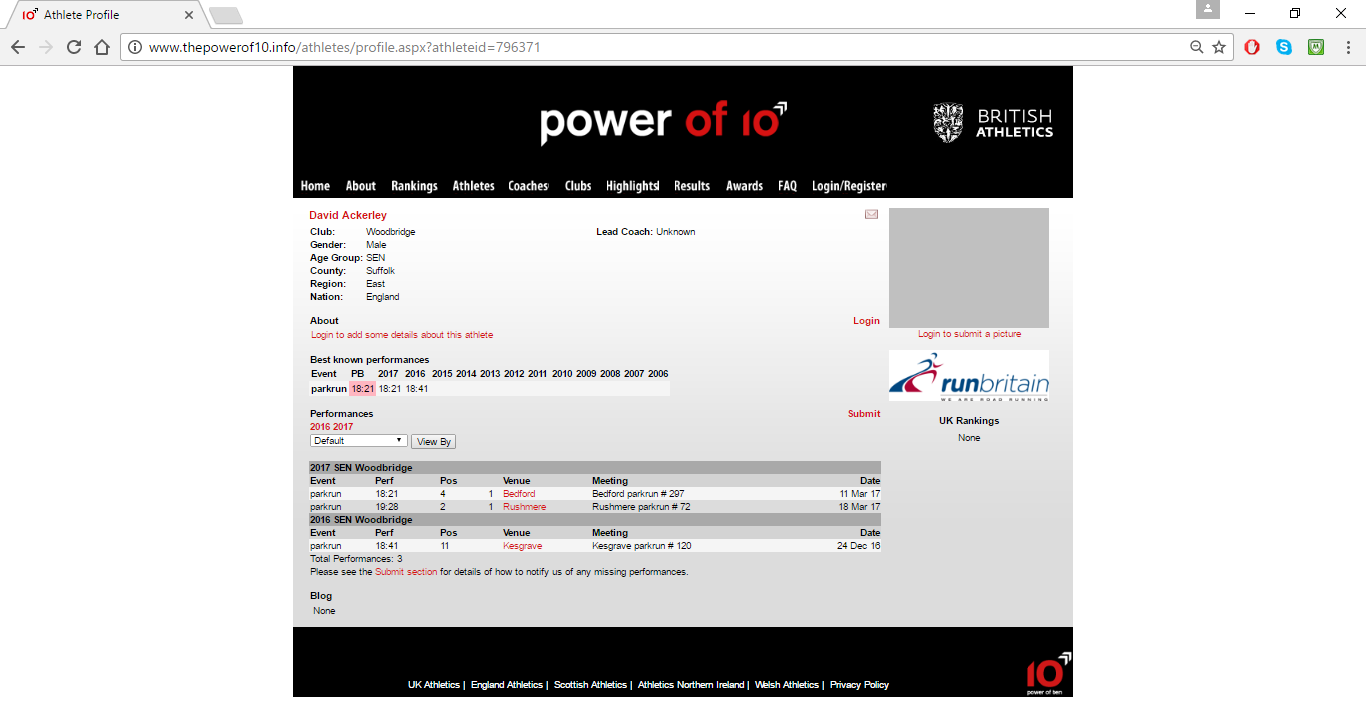 A local running club uses the website to look up the performances recorded for their athletes. The club’s administrator has to perform multiple search tasks, one for each of the 117 athletes, and to compile the individual results into a report. The process of accessing, extracting and collating the relevant details for each athlete is a tedious and time consuming which can take a couple of hours each week.