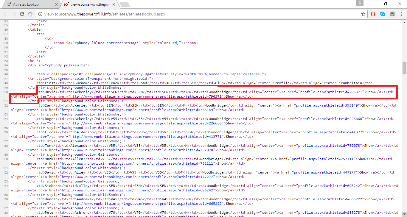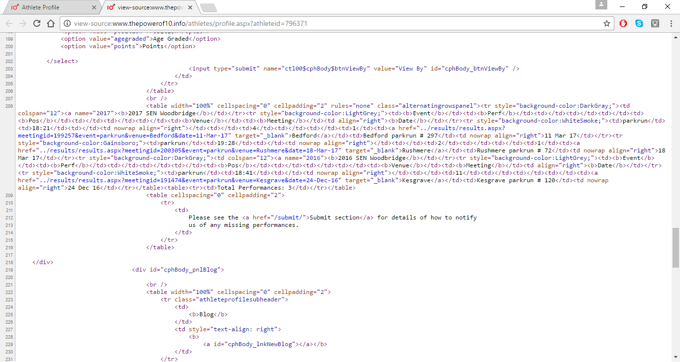 The web page for each athlete’s performance record can be examined, as before, with ‘View page source’. As before, it can be seen that the HTML code has structured tables with tags {tr} & {\tr} delimiting the rows and {td} & {\td} defining data cells. However, examination shows there are 12 cells in each row of the table.