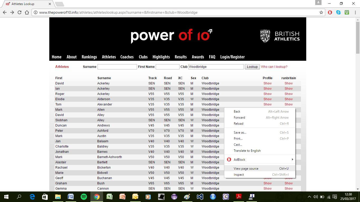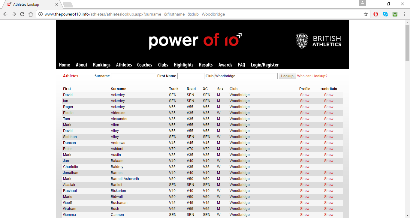 From the home page of the ‘Power of 10’ website users can enter a club name – in this example “Woodbridge”. The application then presents a web page listing members of the relevant club. Note the URL (http://www.thepowerof10.info/athletes/athleteslookup.aspx?surname=&firstname=&club=Woodbridge ). In order to access details of the events an athlete has participated in and their performance the user needs to select the relevant ‘Show’ link under the heading ‘Profile’.