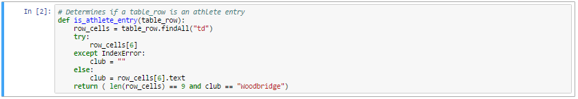 The function get_all_athletes() declares a new array ‘athletes’ to store the data from the source table. It iterates through each row of the webpage (identified by the tag {tr}) and uses the function is_athlete_entry() to check if the row content has the characteristics of an athlete entry. The function tests whether the row has 9 data cells (identified by the tag {td}) and the 7th field in the table contains the text string “Woodbridge”. If the 7th column is empty this test would produce a run time error so I had to include the ‘try’ clause to confirm there is a valid entry. For each row that returns a successful check, the code takes values from table columns and assigns them to variable names “forename”, “surname”, “trackcat” etc.