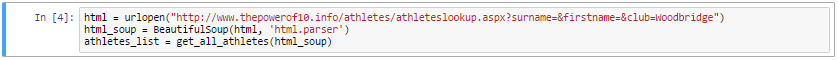 The next steps involve opening the Power of 10 URL (using the Python command ‘urlopen’) and analysing the HTML to find the table which holds the athlete names and extracting the relevant fields. This is achieved within the code through the use of the Python module ‘BeautifulSoup’ and two bespoke functions: get_all_athletes() and is_athlete_entry().