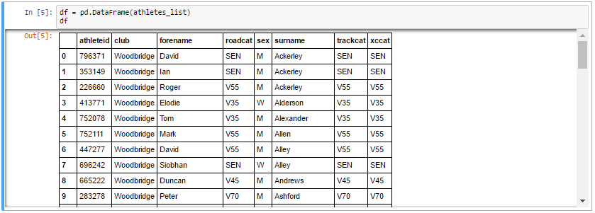 Finally, the one dimensional array ‘athlete_entry’ derived from each table row is appended to the two dimensional array ‘athletes’ and it is this array which is returned and assigned to the array ‘athletes_list’. This is then converted to the Python panda dataframe ‘df’. The output of this dataframe shows that fields have been reordered alphabetically based on the names of column headings.