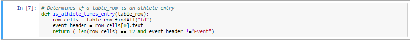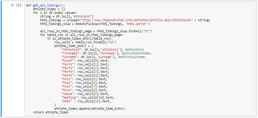 Inspecting the code it is apparent that the ‘athleteid’ is not available in a data cell as a textual value but can be found embedded in a string within the <a href > tag. Consequently, the command to extract the identifier is different to other fields. The reference ‘row_cells[7].a’ refers to the text string in the < a > tag of column 8. The ‘str’ function allows the text string to be manipulated: [32:38] selects the substring from the 32nd to the 38th letters where the ‘athleteid’ can be found. Running the code a few times found that ‘athleteids’ are not always 7 digits and for shorter strings superfluous characters (such as quotes [“] and tag braces [>]) need to be removed.