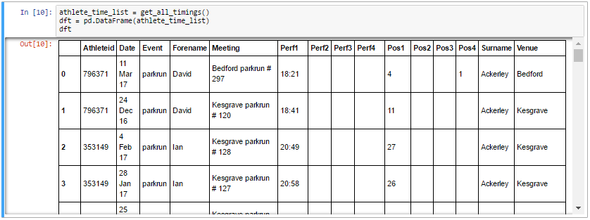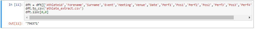 The athlete performances were added to the Python dataframe ‘dft’. By default the column headings are alphabetically arranged which isn’t ideal. The data fields (e.g. ‘Forename’, ‘Surname’) can be reordered easily by panda to the desired format using the command dft[[‘field1’, ‘field2’, …]]. Finally, the contents of the panda table (dft) holding the details of each athlete’s performance record can be exported to a named csv file using the command dft.to_csv(‘filename.csv’).